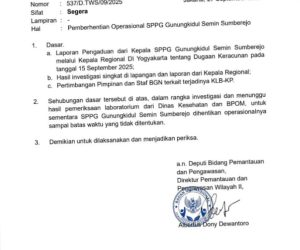 Foto: Surat Pemberhentian Operasional SPPG Harian Rakyat, Gunungkidul – Pasca keracunan 19 pelajar di Kapanewon Semin, Badan Gizi Nasional...